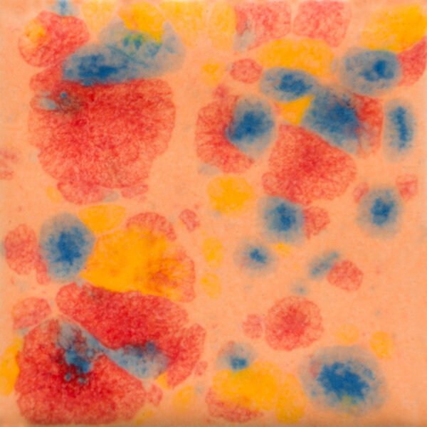 Peach Party es un esmalte opaco de base color durazno con grandes cristales rojos, azules y amarillos.